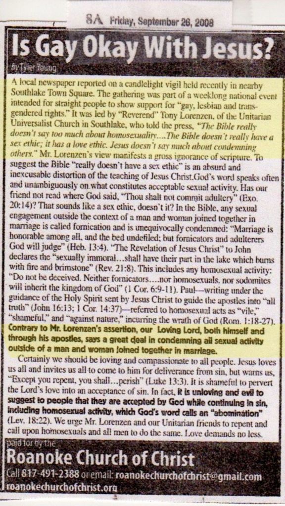 One of my first public ministries in Texas was to speak out on this issue. This is the report in the Fort Worth Star Telegram – “New pastor, a Harvard grad, brings search for tolerance to Southlake” | Religion | Star-Telegram.com This event and the news coverage it generated drew some fire from the fundamentalist fringe: